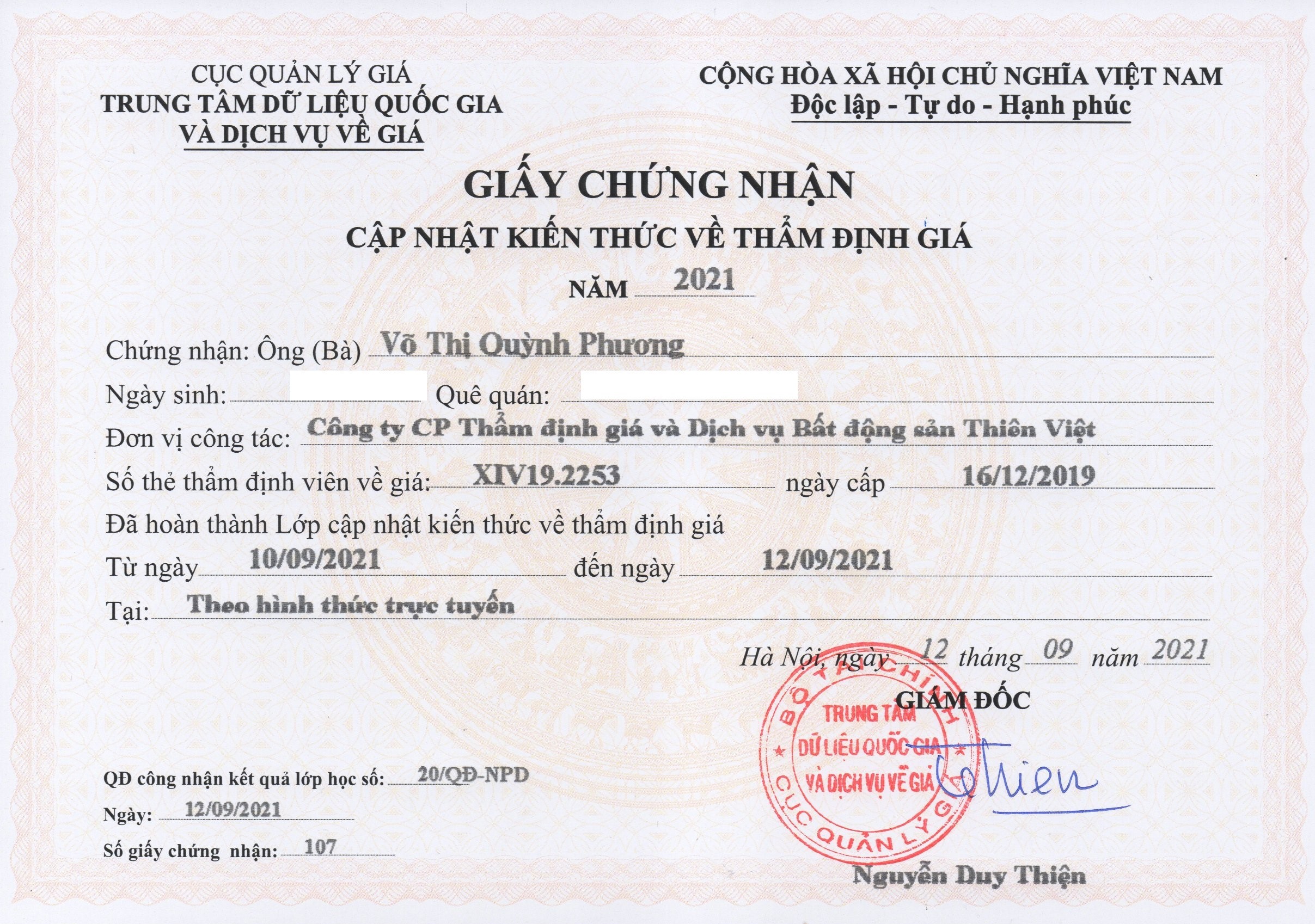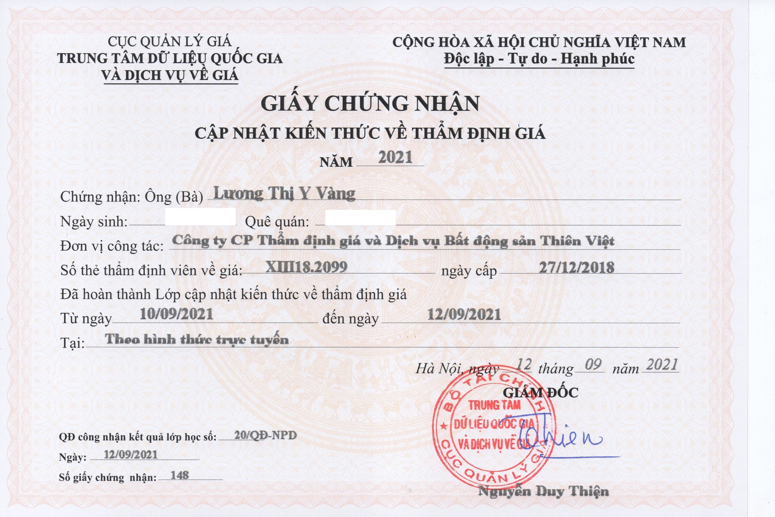 Giấy chứng nhận cập nhật kiến thức thẩm định giá